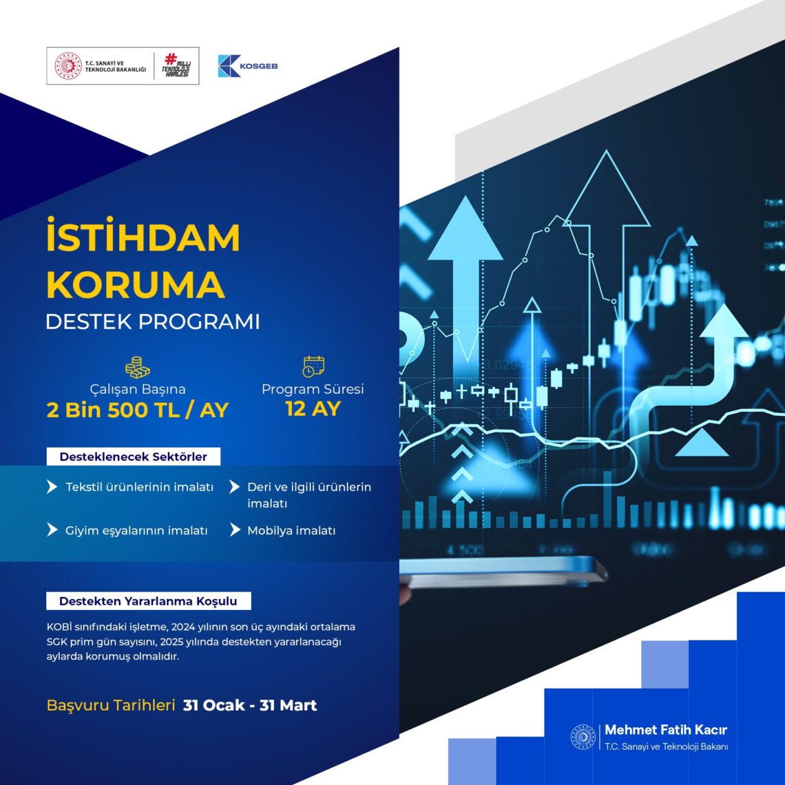 KOSGEB tarafından başlatılan İstihdam Koruma Destek Programı kapsamında; tekstil, giyim, deri ve mobilya imalatı sektörlerinde faaliyet gösteren işletmelere, çalışan başına aylık 2 bin 500 TL geri ödemesiz destek sağlanacaktır.
